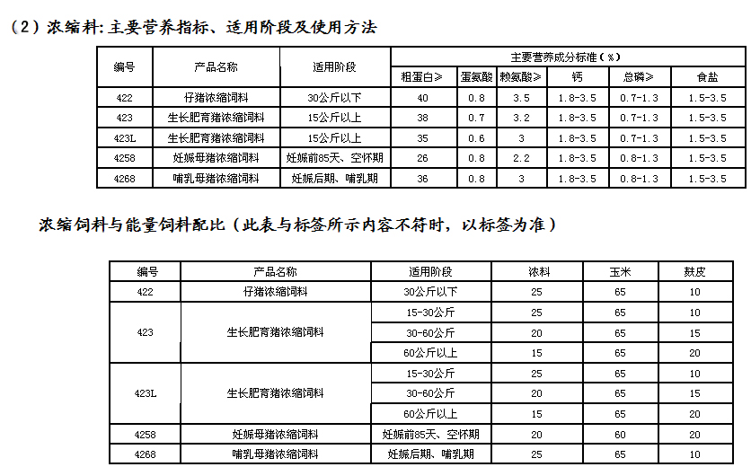 ?配合料可直接喂豬,嚴禁在配合料中添加其它原料;用濃縮飼料配制配合飼料時,嚴格按標簽所示配比進行配料。濃縮飼料不得直接喂豬。